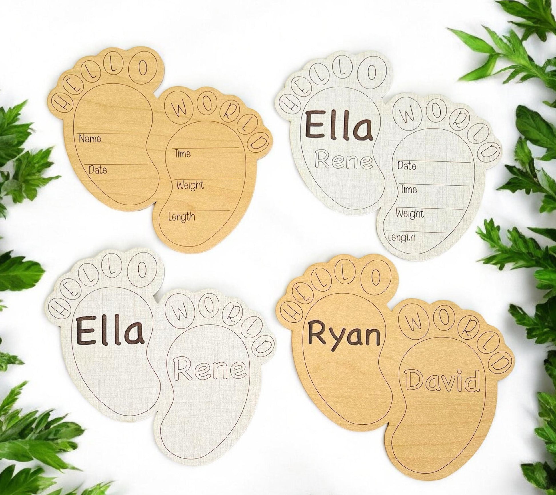 Baby Feet Shaped Birth Announcement Cute Hello World Wooden Laser Engraved New Baby Name Stats Photo Prop Newborn Baby Shower Gift Memento