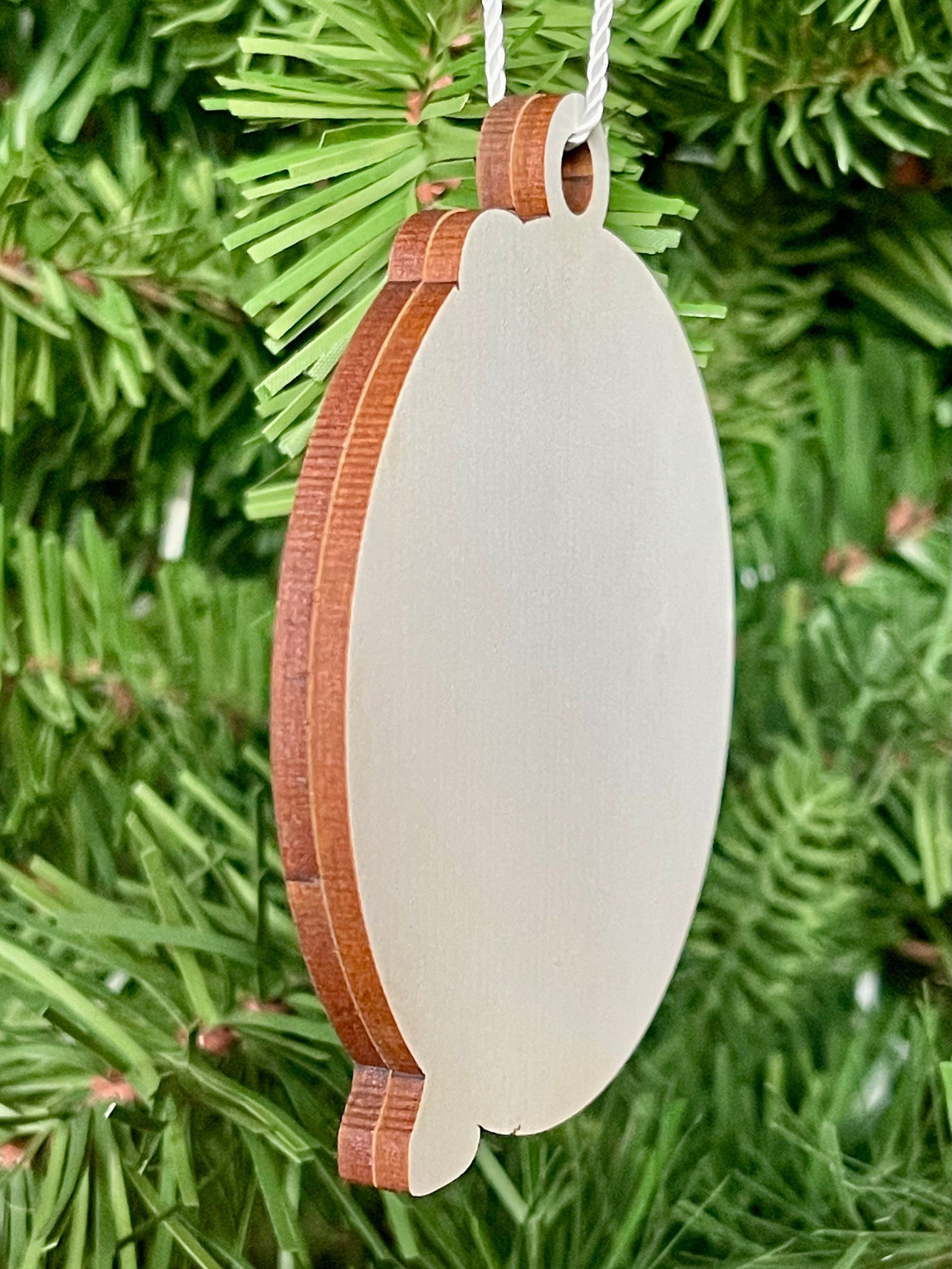 The ornament measures an ideal 3 inches around, with a sustainable birch front and a plain white back. The layers give the ornament a 3D look, and the white back allows you to write a message, add a date, attach a photo... anything you want! The sturdy, substantial ornament is 1/4 of an inch thick.