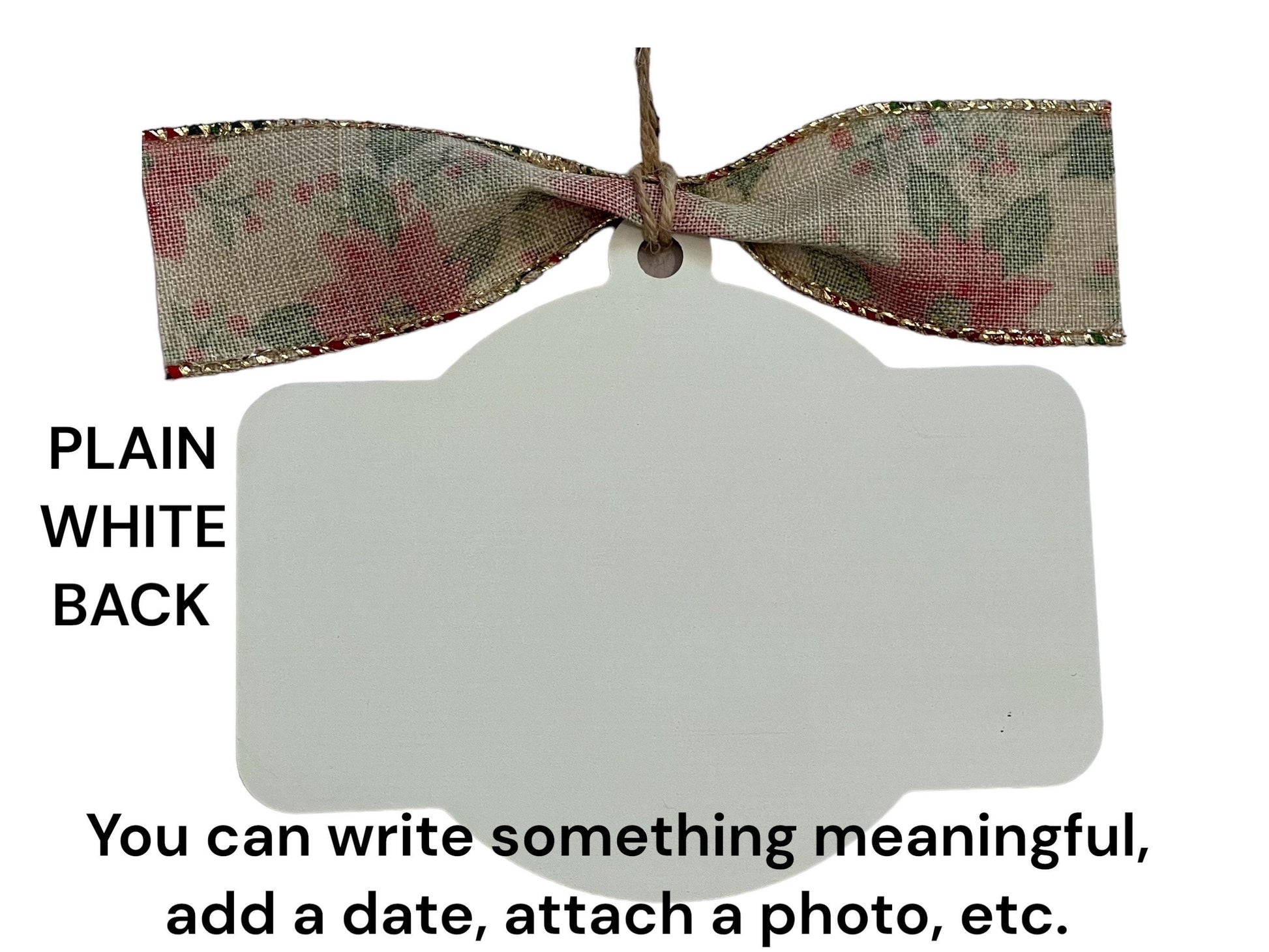 Personalized with the city, state, and ZIP code of your choice, this engraved white ornament with a pretty bow will be a custom-made Christmas gift hit! The back of the ornament is plain white, so you can write something memorable, add a photo... anything you'd like. I will add a pretty Christmas ribbon bow (easily removable), too.