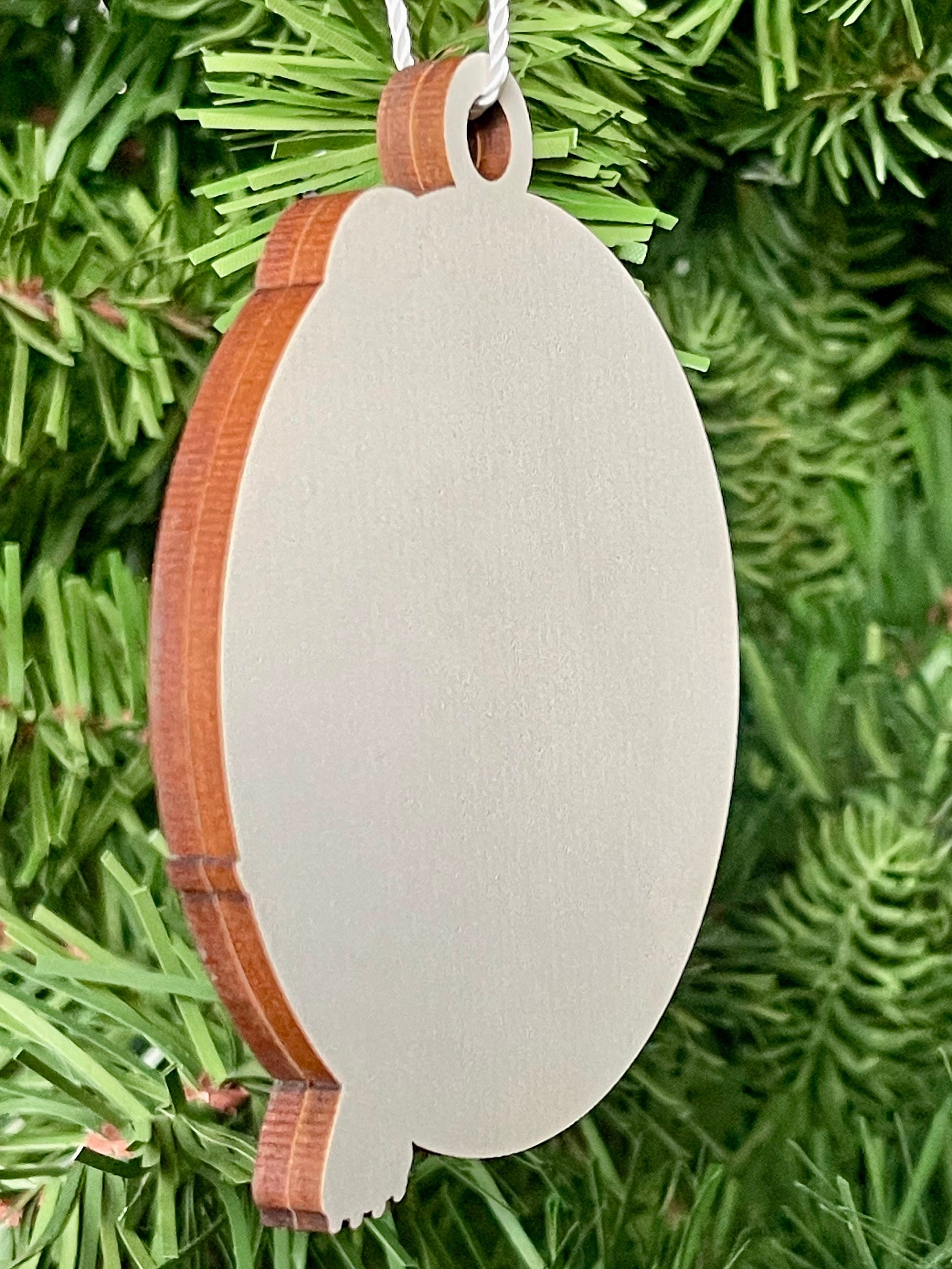 The ornament measures an ideal 3 inches around, with a sustainable birch front and a plain white back. The layers give the ornament a 3D look, and the white back allows you to write a message, add a date, attach a photo... anything you want! The sturdy, substantial ornament is 1/4 of an inch thick.