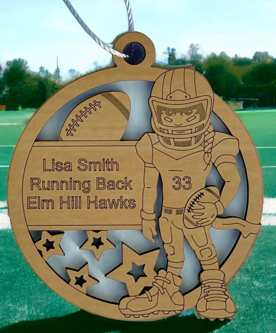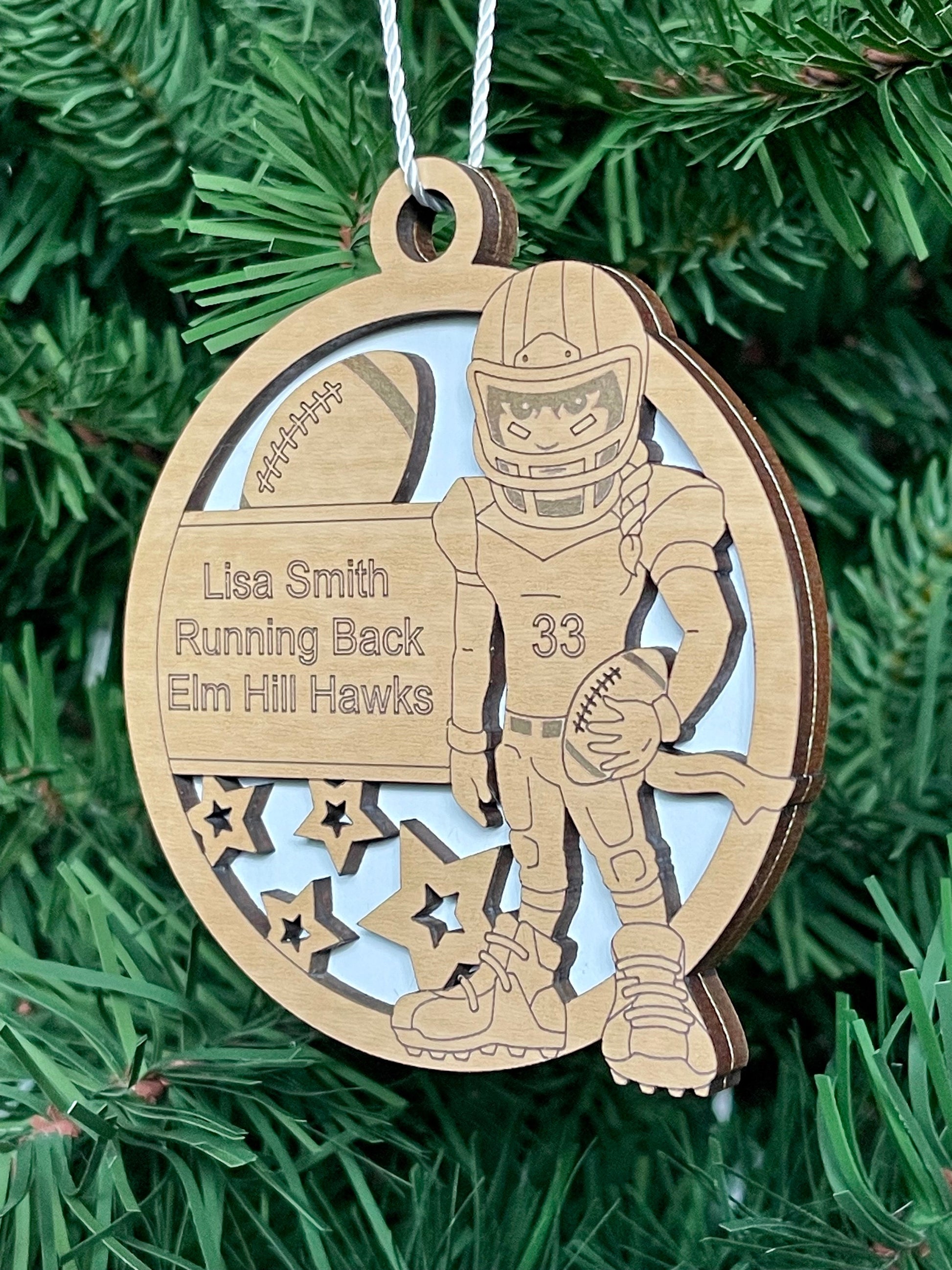 Custom Female Football Ornament Personalized Name, Number, Position, School, Stats, Etc. 3D Layered Year-Round Fun Gift Idea Handmade OOAK