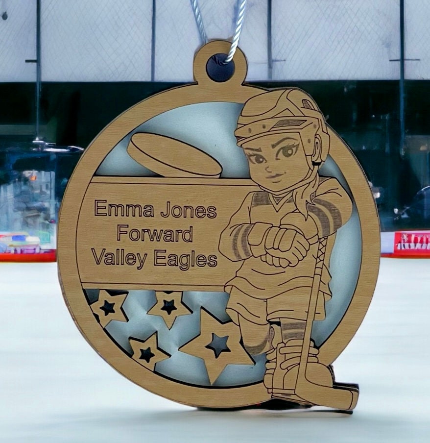 Custom Female Ice Hockey Ornament Personalized Keepsake Name, Position, Team, School, Stats, Etc. Laser Engraved Puck Stick Gear Hockey Gift