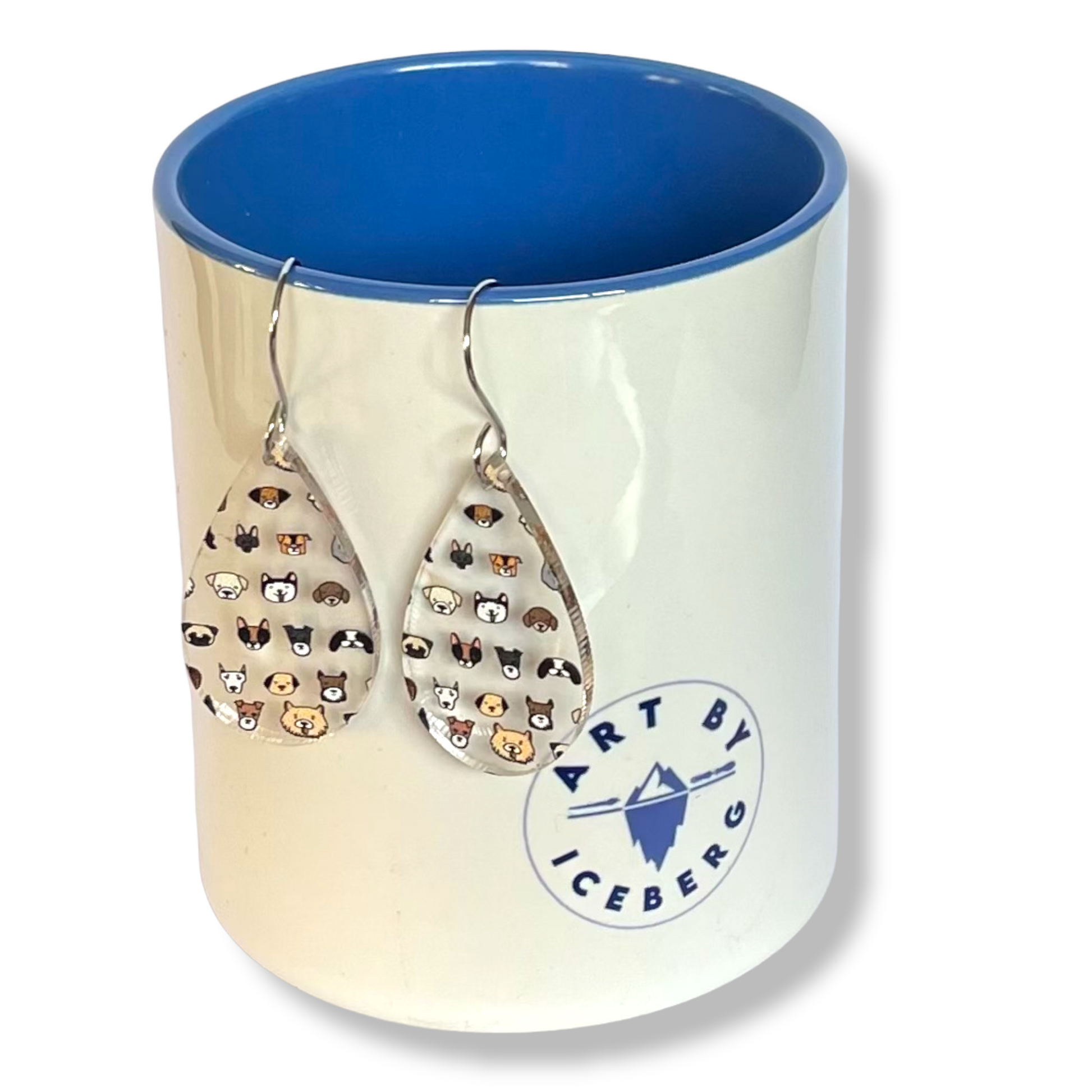These earrings are lightweight, 1/8 inch clear acrylic (so the dog face pattern will show on the back, too), are ideal for any dog lover, vet or vet tech, a rescue fundraiser... you name it! A real conversation piece.