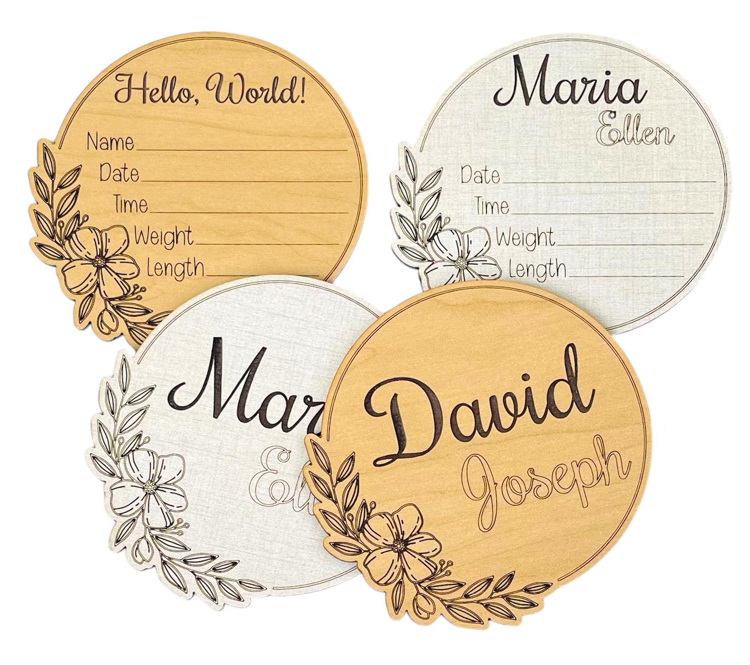 Beautiful floral birth announcement sign with gorgeous flowers engraved to make the piece a true stunner! This pretty wooden baby announcement is an ideal baby shower gift or hospital or nursery photo prop. Announce your little one in style with a unique, custom item that you'll treasure forever.