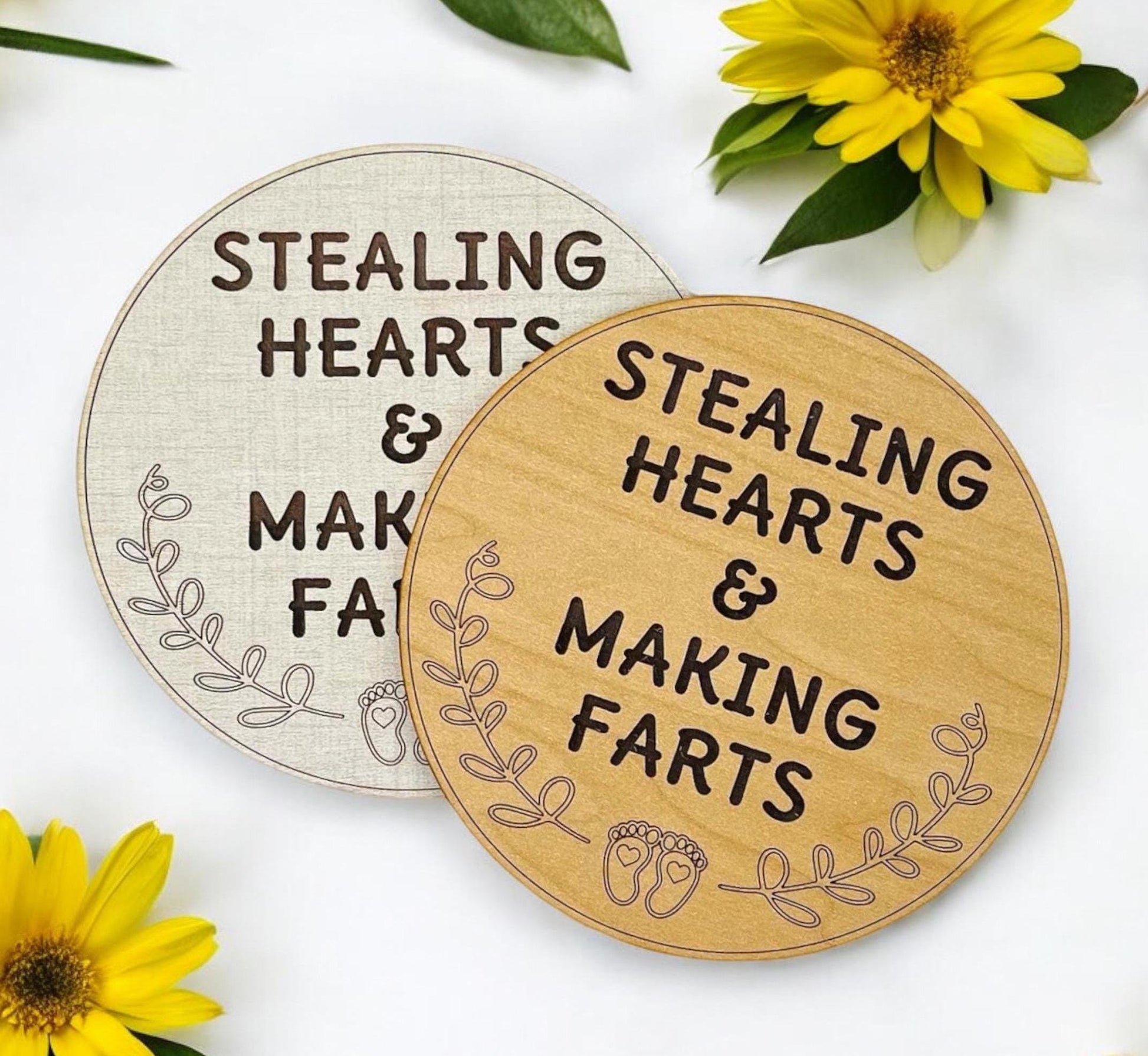 Humorous baby photo prop sign that will have everyone smiling! "Stealing hearts and making farts" engraved wood round will delight anyone who sees the resulting photo. Show off your newborn in style with a funny, handmade item that you'll treasure forever. Perfect baby shower or new baby gift!