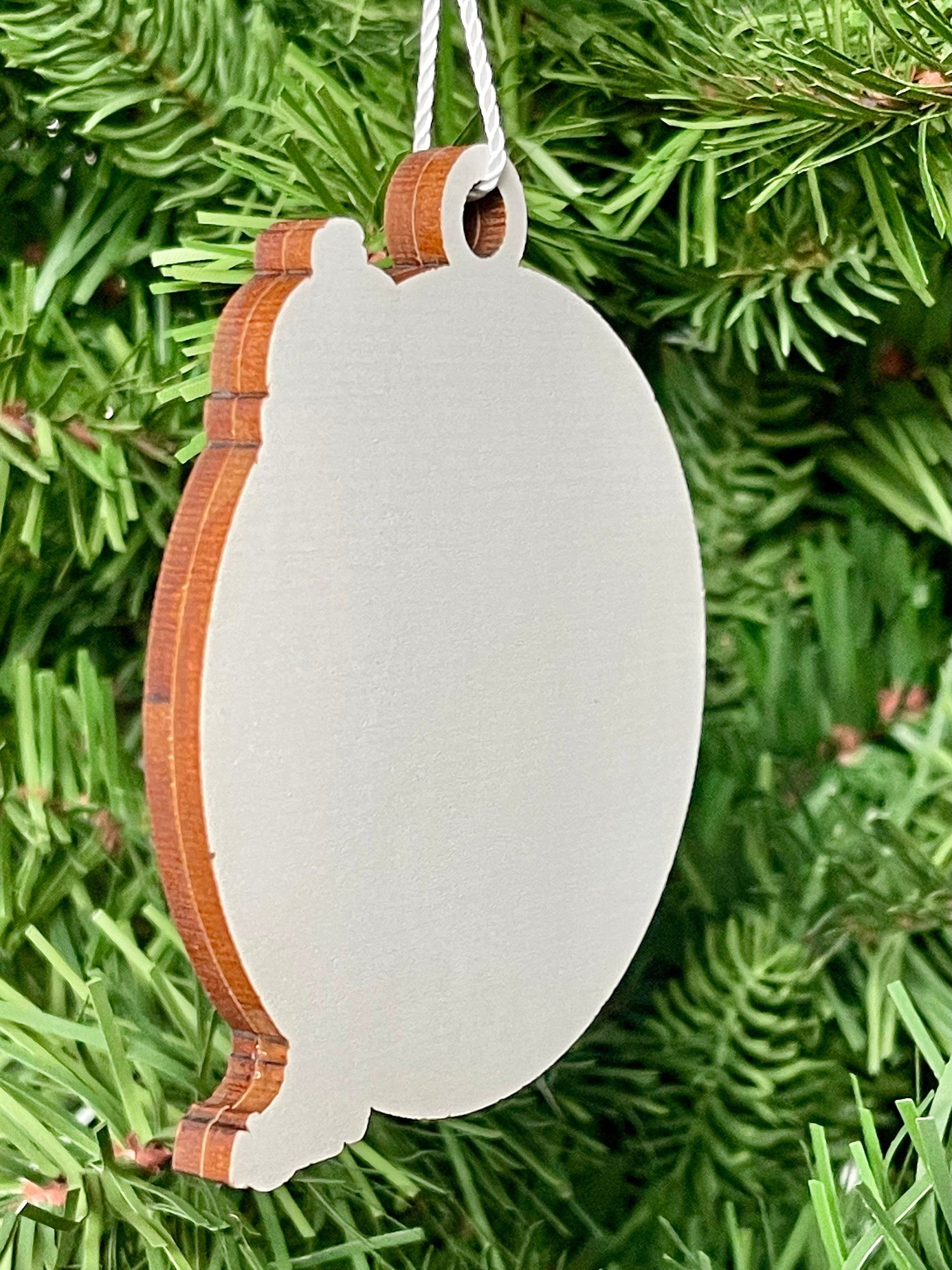 The ornament measures an ideal 3 inches around, with a sustainable birch front and a plain white back. The layers give the ornament a 3D look, and the white back allows you to write a message, add a date, attach a photo... anything you want! The sturdy, substantial ornament is 1/4 of an inch thick.