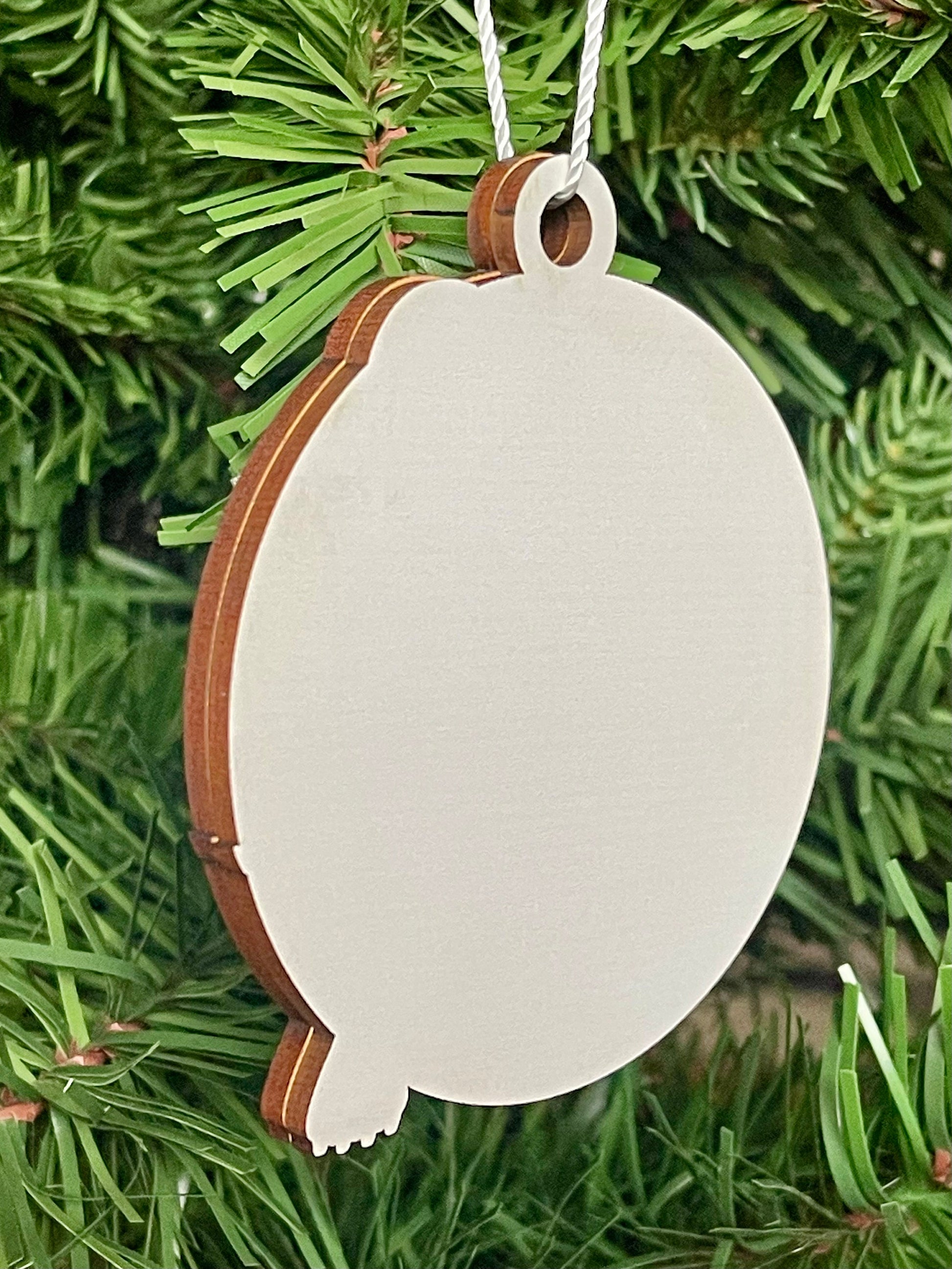 The ornament measures an ideal 3 inches around, with a sustainable birch front and a plain white back. The layers give the ornament a 3D look, and the white back allows you to write a message, add a date, attach a photo... anything you want! The sturdy, substantial ornament is 1/4 of an inch thick.