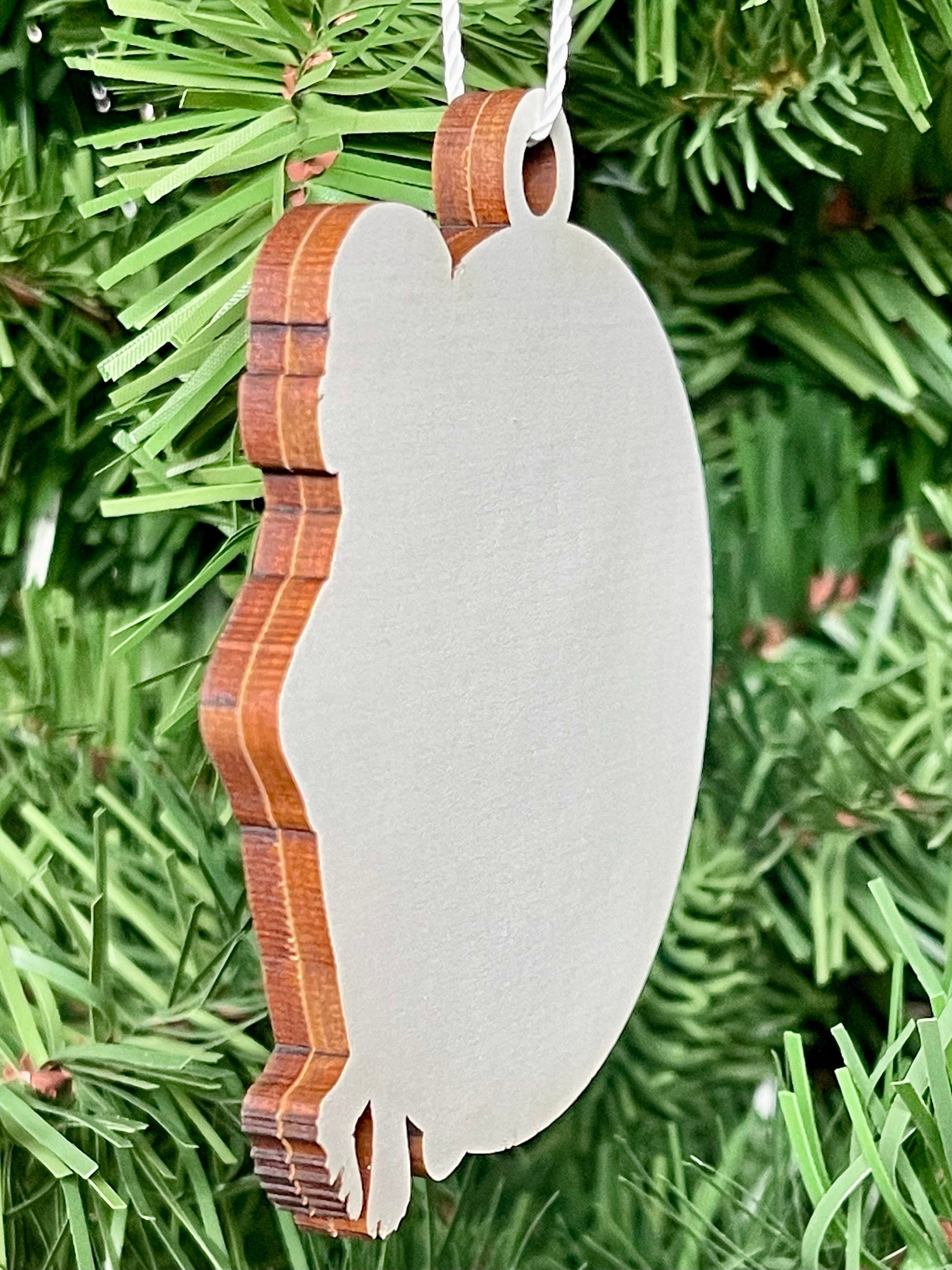 The ornament measures an ideal 3 inches around, with a sustainable birch front and a plain white back. The layers give the ornament a 3D look, and the white back allows you to write a message, add a date, attach a photo... anything you want! The sturdy, substantial ornament is 1/4 of an inch thick.