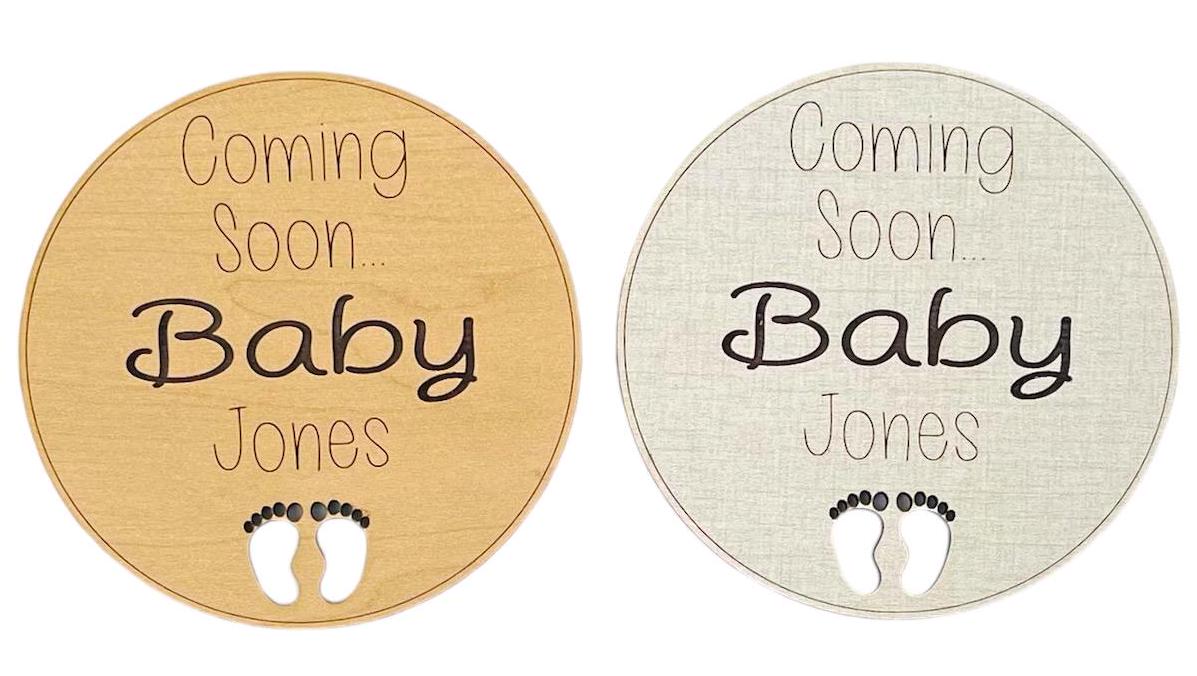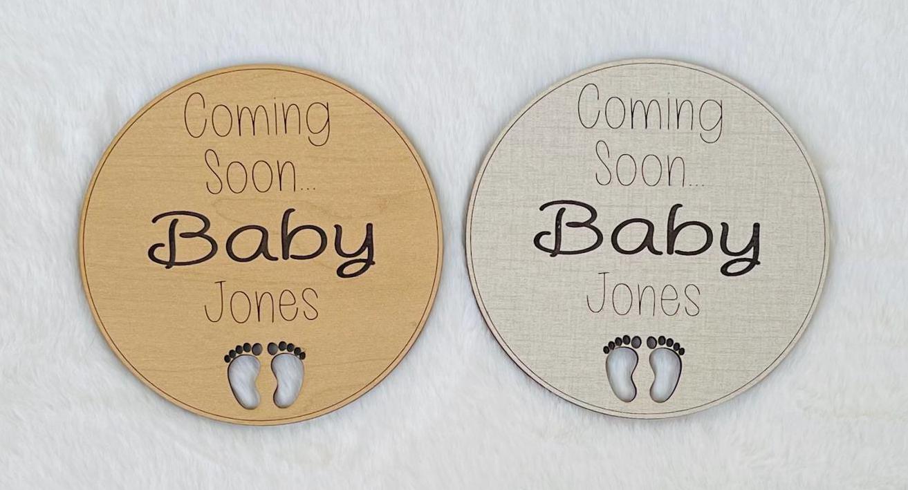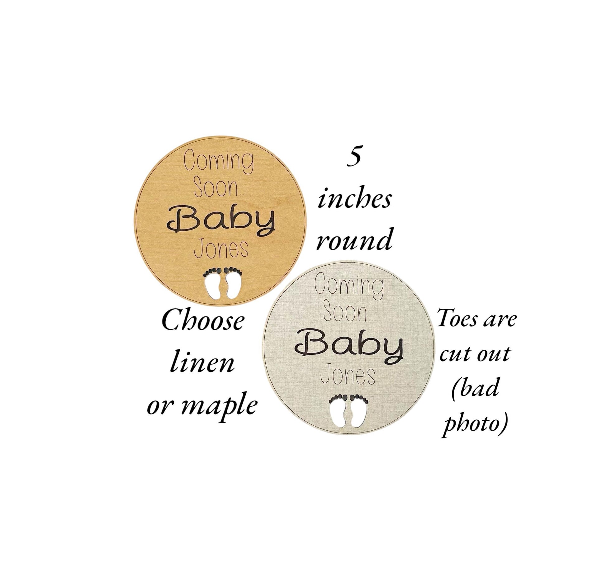 Personalized Pregnancy Announcement Sign Coming Soon Name Baby Feet Photo Prop Custom Engraved Handmade Linen Maple Wood Expecting Keepsake