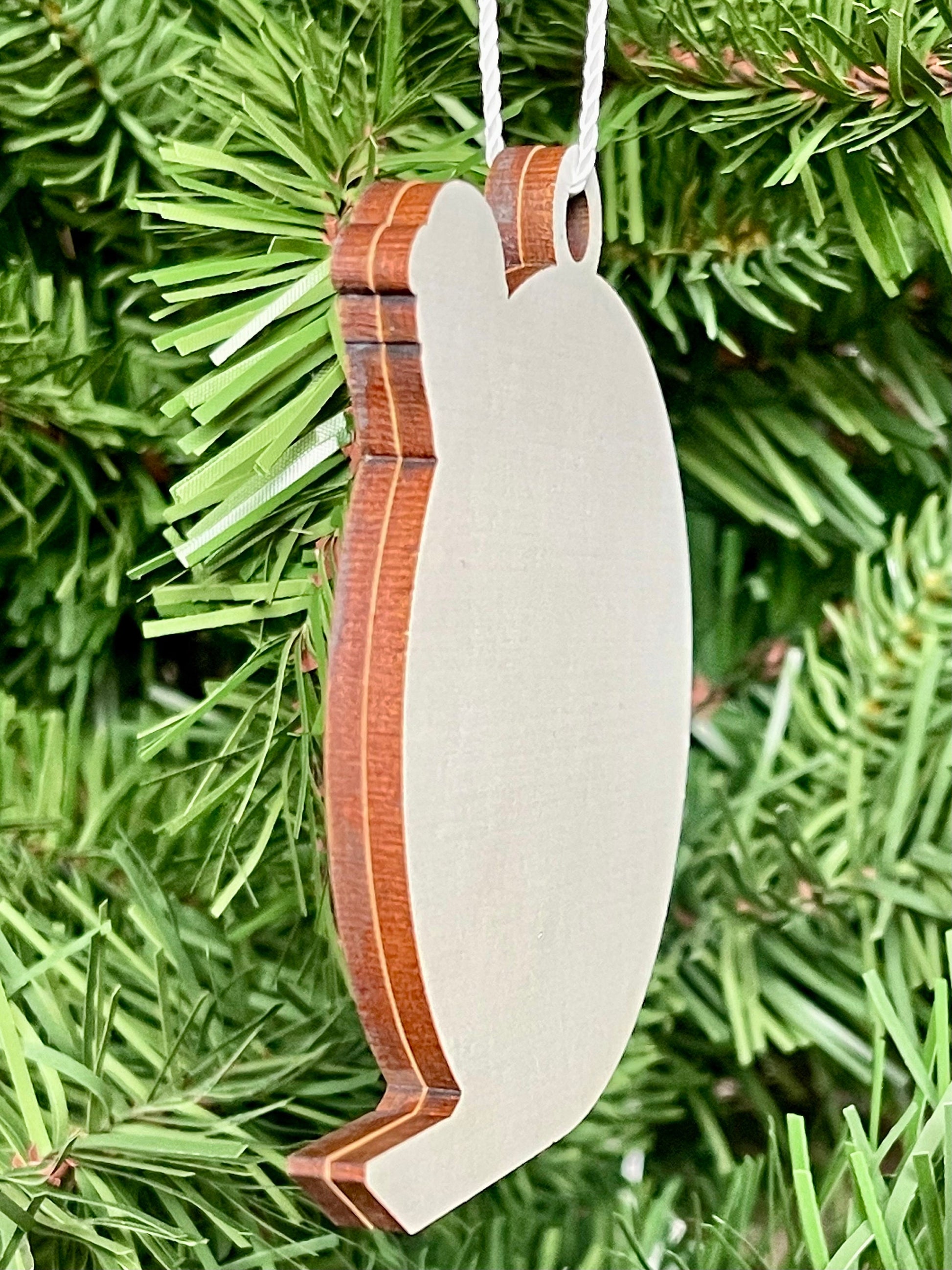 The ornament measures an ideal 3 inches around, with a sustainable birch front and a plain white back. The layers give the ornament a 3D look, and the white back allows you to write a message, add a date, attach a photo... anything you want! The sturdy, substantial ornament is 1/4 of an inch thick.